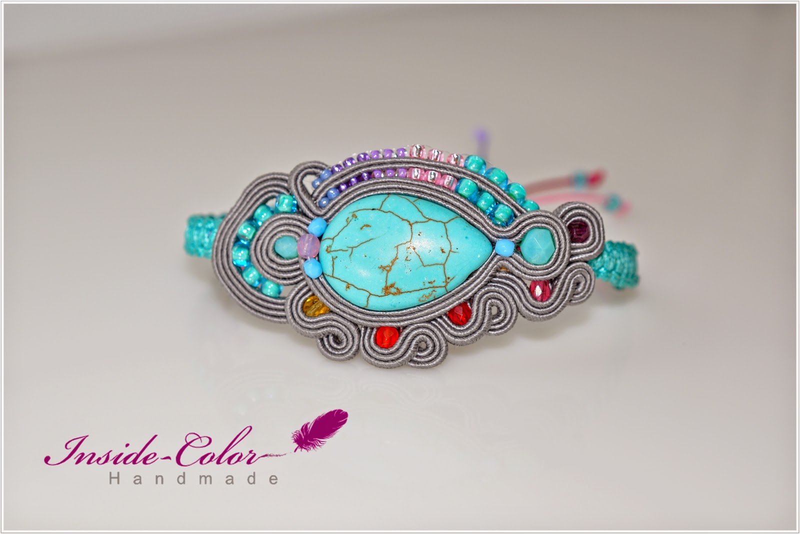Bransoletka wykonana w technice haftu sutasz oraz makrama. Łezka howlitu została otulona szarym sznurkiem sutasz oraz ozdobiona japońskimi i czeskimi szklanymi koralikami. Zaczepiona na bazie wykonaną makramą z regulowaną szerokością na różne nadgarstki.