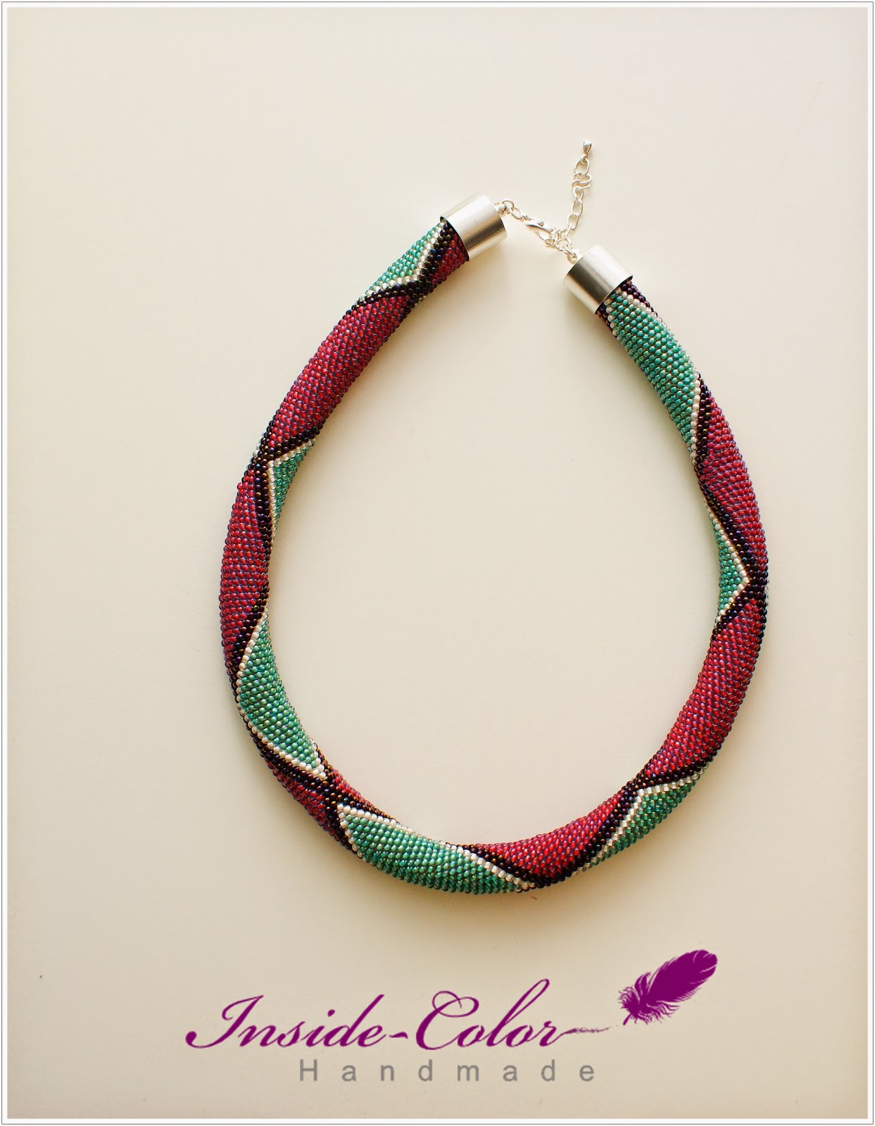 Naszyjnik wykonany metodą bead crocheting, inaczej sznur koralikowo-szydełkowy (ukośnik). Średnica na 18 koralików w rzędzie. Stworzony w sumie z 4551 koralików!